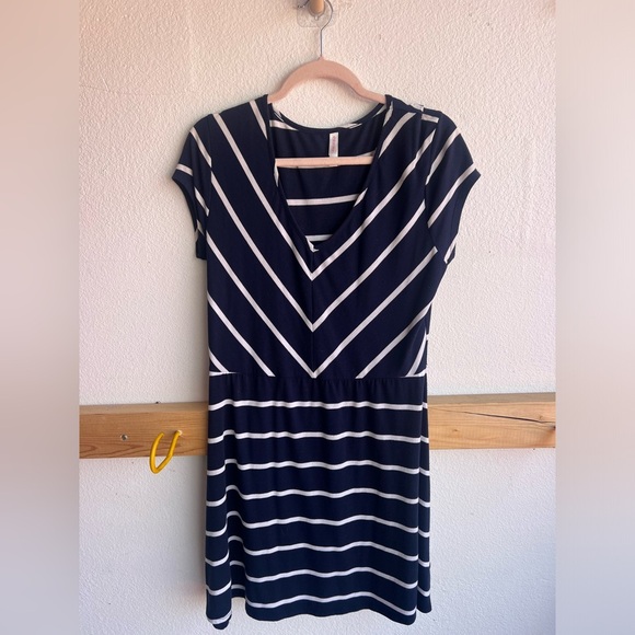 This casual midi dress by Xhilaration showcases a chic fit and flare silhouette with a flattering V-neckline. The cap sleeves and blue and white color scheme add a touch of elegance to its relaxed style, making it perfect for everyday wear.