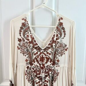 This boho cream dress features a beautiful brown floral pattern, perfect for spring and summer. Offers welcomed.