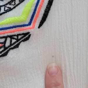 Colors: White almost very slightly off-white fabric, black / teal / blue / flourescent yellow / flourescent coral embroidery detail