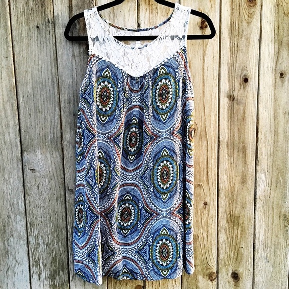 Xhilaration Boho Print & Lace Tunic Sun Dress Sleeveless Midi Dress