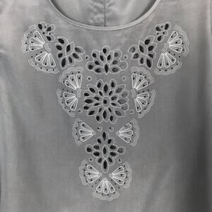 Bubble sleeve scoop neck top in dark gray. Long sleeve, button down in back, cute eyelet front design, semi high-low hem. 100% polyester. In good used condition. No stains, tears or holes.
