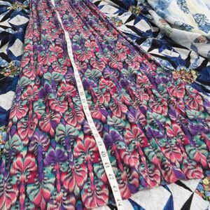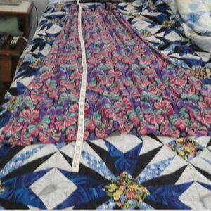 This gorgeous preowned size Medium/Small maxi dress features a bustier type upper with black piping trim. It does not have actual metal boning. Bust is very lightly padded, but there is not an actual bra. It has adjustable straps. Elastic shirring in the back making the waist adjustable.