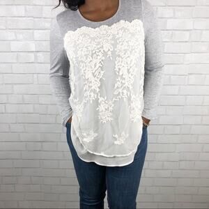 Xhilaration Embroidered Lace Front Long Sleeve Blouse in Gray Cream Size Medium