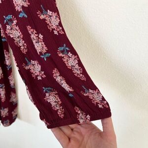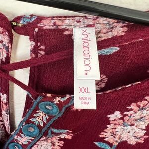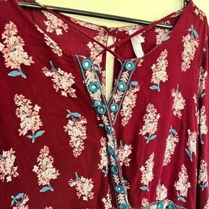 Maroon and pink floral print with turquoise embroidered embellishments. Could be worn as a short dress or tunic over leggings (so cute with boots!).