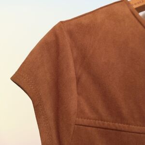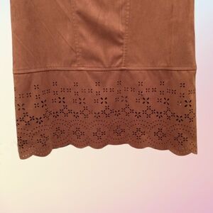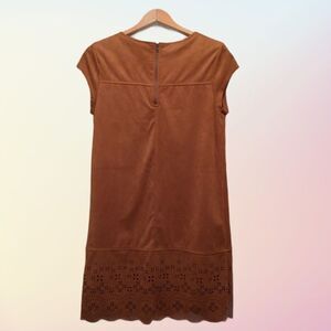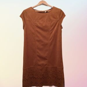 This gorgeous dress by Xhilaration is made of polyester but looks and feels like suede. It's very light, has cap sleeves, and a laser cut design at the bottom. It's also lined. It's petite enough that it can double as a tunic for medium heights and talls.