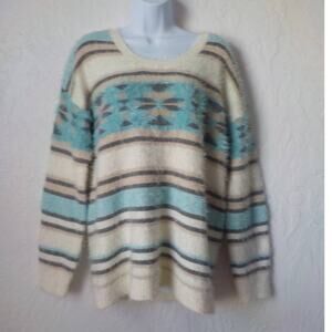 Xhilaration Fluffy Ivory Teal Striped Pullover Sweater Women Large Western Boho