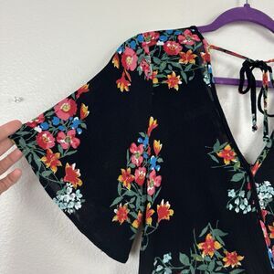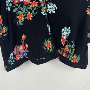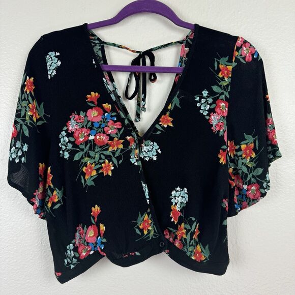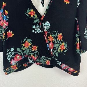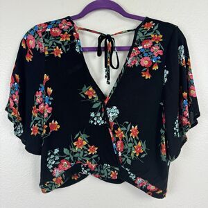 Xhilaration Gauzy Boho Flutter Sleeve Floral Cropped Wrap Top Black Pink Small