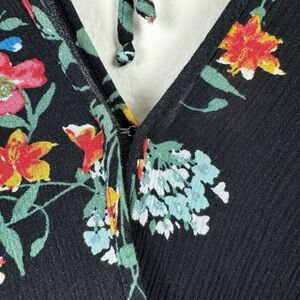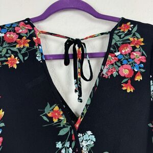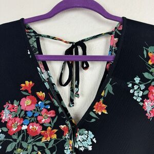 True wrap top. Buttons under bust and hook and eye closure on neckline. Surplice v-neckline on front and back. Tie on upper back. Elastic at back waistband. Flutter style short sleeves. Darts at bust. Gauzy material. Black with an allover floral print in pink, red, green, blue, yellow, and white multicolor. Pre-owned condition. Size small.