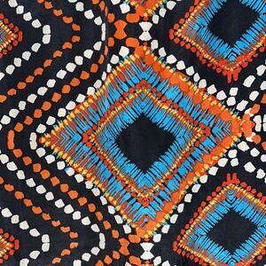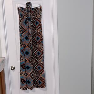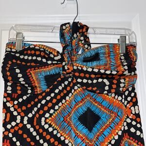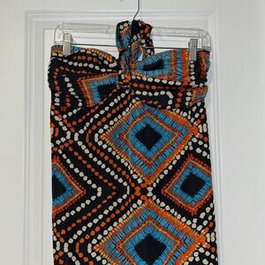Xhilaration geometric print maxi dress, size Medium. Can be strapless or halter with the tie. Blue, orange, yellow and cream geometric print on black background. Maxi length (49” from top of bodice to hem). In excellent used condition.