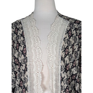 Xhilaration L/XL Open Front Crochet Trim Aztec Print Kimono Black Pink Tan