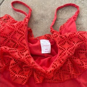 This vibrant redish orange lace mini dress by Xhilaration is perfect for casual and resort wear. It features a sleeveless design with spaghetti straps and a playful ruffled neckline, adding a touch of elegance to its comfortable, stretchy fabric. The dress's A-line silhouette offers a flattering fit for any laid-back occasion.
