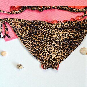 🖤 Bottom: Scrunch back tie-side bikini bottom with same leopard print, matching coral lining, and coordinating bead accents.