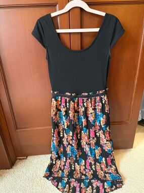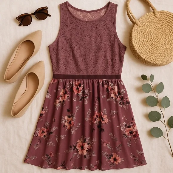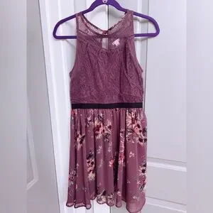 This Xhilaration dress combines a romantic mauve lace bodice with a softly flowing floral skirt. Designed with a high neckline and flattering fit-and-flare silhouette, it offers a feminine, breezy option ideal for warm-weather occasions.