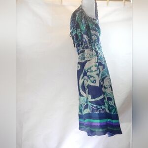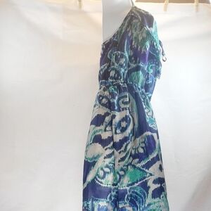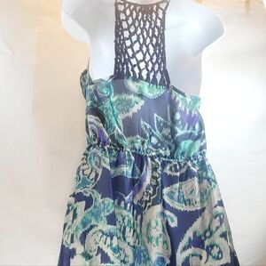 Gently used Xhilaration mini halter dress in deep blues and greens, with a tie in front. Approximate measurements: 13" bust, 10" waist, and 27" hem. #halter #minidress #xhilaration