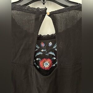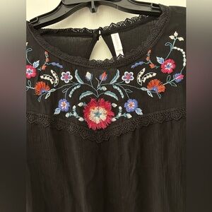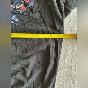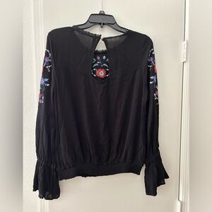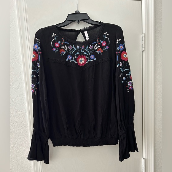This stunning black blouse from Xhilaration features long bell sleeves adorned with vibrant red, pink, and blue floral embroidery. The embellished design and ruffled sleeve cuffs add a touch of elegance, making it a perfect choice for any stylish occasion.