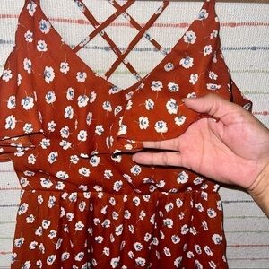 Xhilaration Burned Orange Floral Dress. Sleeveless, crisscrossed straps, non adjustable. Floral print. Ruffled neckline that goes all around. High waist. Invisible zipper on back and hook-and-eye closure. Underlining fabric. Light fabric overall. Mini dress. NWOT. Pet and smoke free home.