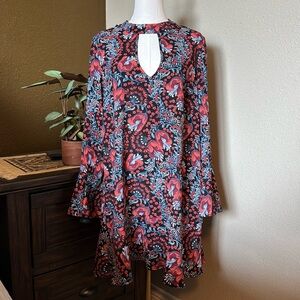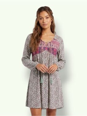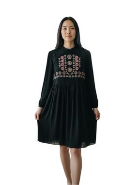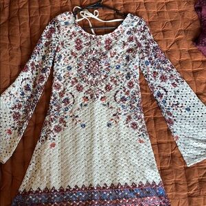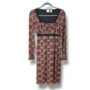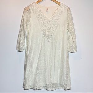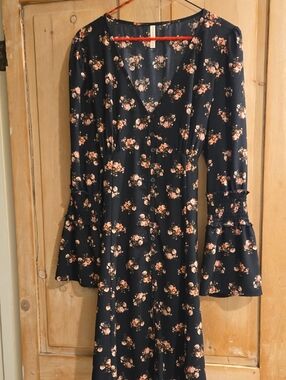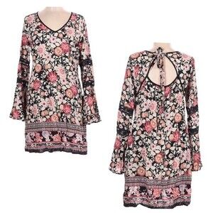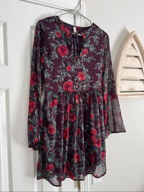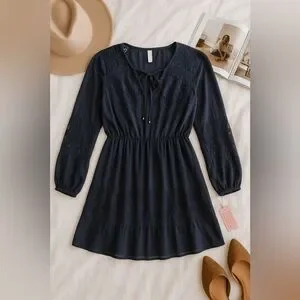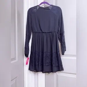 This Xhilaration dress features an elegant dark blue chiffon design with delicate lace detailing throughout the bodice, sleeves, and hemline. Designed with a flattering elastic waist and flowy skirt, it offers a chic yet comfortable option for both casual and dressier occasions.