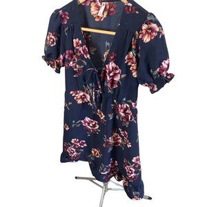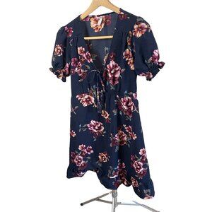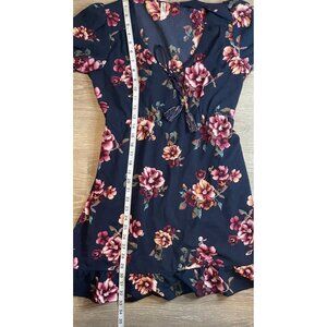 Xhilaration Navy Floral V Neck Faux Wrap Ruffle Hem Knee Length Dress Sz XS