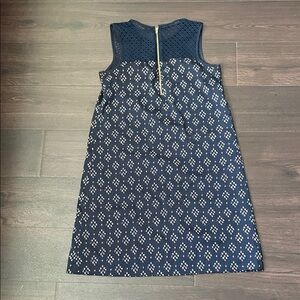 Stylish mini dress with navy and white pattern. Sleeveless design. Perfect for casual outings.