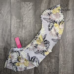 Charcoal elegance meets seaside grace in this alluring off-shoulder bikini top from Xhilaration. Never worn and still bearing its original tags, this perfectly polished piece promises carefree summer afternoons and moonlit beach walks, its stretchy polyester-spandex blend ensuring both comfort and timeless sophistication.