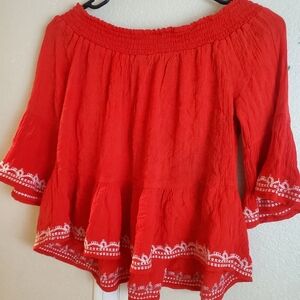 Xhilaration off the shoulder floral embroidered peasant hippie blouse. Bright red color with multicolor floral embroidery. Ruffled bell sleeves. Peplum hem.