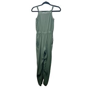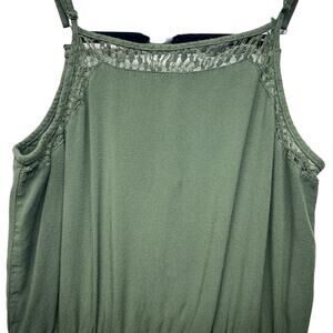 Xhilaration women's jumpsuit in olive green. Sleeveless. Square neck with lace trim detail. Elastic waist. Side zip pockets. Elastic bottom hem. Hidden back zipper. In good used condition. No stains, tears or holes.