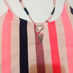 Shades of pink bathing suit. Blush pink with mauve, hot pink, coral pink, and navy blue stripes. Small cutout at the top. Scoop back with fun strappy back (makes a diamond like shape). Straps are not adjustable.