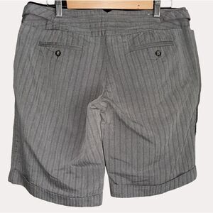 Chino style shorts. Pockets at hips. Cuffed. Mid-rise. Gray with dark gray stripes.
