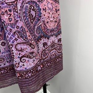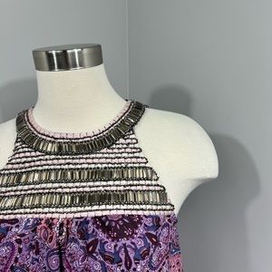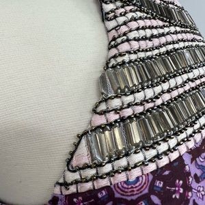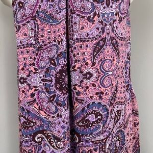 Size S. Lightly worn but in good condition. purple multicolored pattern with jewel details across neckline. Some signs of wear on the jewels-shown In photos. Buttons on the back with keyhole cutout. 34.5 inches long from shoulders down chest is 17 inches across (Measurements approximate) polyester material