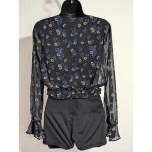 Featuring a delicate black mesh overlay adorned with blue and yellow floral prints, this lightweight blouse adds a touch of femininity to any outfit. The deep V-neckline, elastic waist, and ruffled cuffs create a flattering silhouette, making it perfect for layering or wearing on its own.