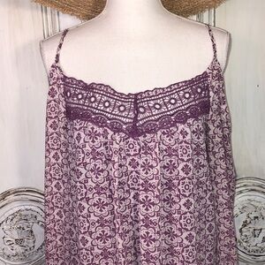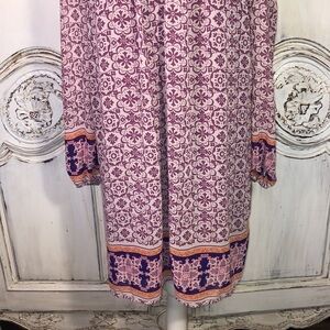 Xhilaration Sheer Lined Long Sleeve Cold Shoulder Dress Size Medium Dusty grape and white with colorful border at Hemline and Sleeves Lace across , Front Bodice Fully lined Adjustable straps Measurements Chest 18 1/2” pit to pit Length 27” pit to hem B#F