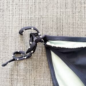 Adjustable side ties with subtle white dot details allow for a custom fit.