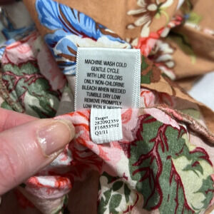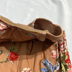 Xhilaration tan strapless dress with floral print in blues, pinks, reds, greens and cream. Corset top with boning, fit and flare shape. With pockets!!!! The only flaw I see is where the boning is sort of poking out of the left side bust area, but I don’t think it would be obvious when it’s on. Super cute dress! Measurements taken when dress is lying flat and are approximate.