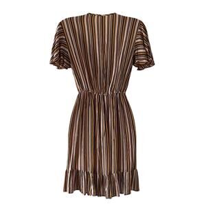 Chic and stylish, this striped dress features a flattering V-neck and a tie waist for a perfect fit. The brown and white color combination adds a touch of elegance to your wardrobe.