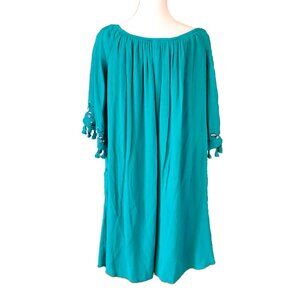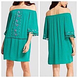 Xhilaration Teal Floral Embroidered Off Shoulder Dress Fringe Boho Women's Sz XL
