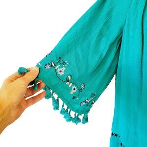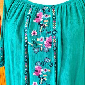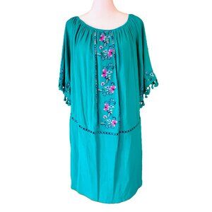 This teal floral embroidered off-the-shoulder dress by Xhilaration features a beautiful teal blue-green color with intricate floral and vine embroidery, short sleeves accented with tassels, a knee length hem, A-line silhouette, a lining, and an elasticized neckline that can be worn on or off the shoulder. The shell is 100% rayon, and the lining is polyester. This pullover dress is machine washable. Women's size XL. I have a black one in size XL listed as well, shown in the last photo.