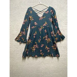 Xhilaration Teal Floral Print Babydoll Dress Small S Long Sleeve Mini Cross Back