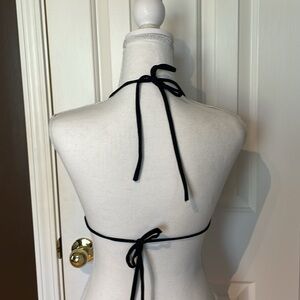 Vibrant tropical print halter bikini top. Features a mix of green, orange, and black colors. Size M