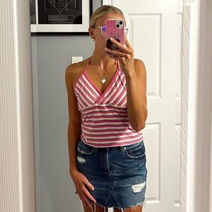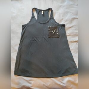 Turquoise tank top with lace back. Features button-down front and chest pockets.