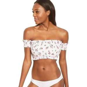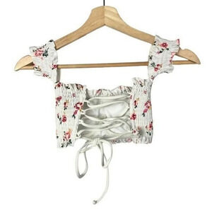 Xhilaration White Floral Smocked Cap Sleeve Lace Up Back Swim Top XS