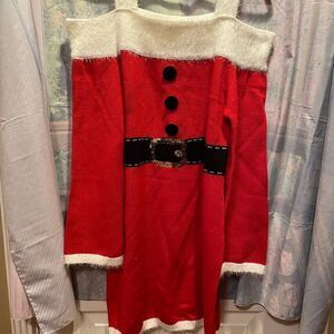 Soft feels like cashmere. Off the shoulder! Red with white trim and black sequin accents. It’s a beautiful dress! Great condition not stains or holes. Size large