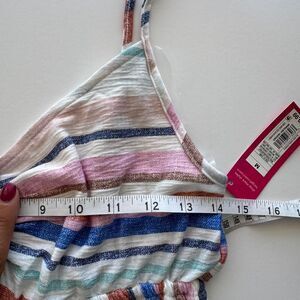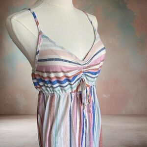 multi-colored stripes, tie front, adjustable straps, front cutout, summer wear, boho style, casual jumpsuit, vibrant pattern, lightweight fabric