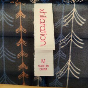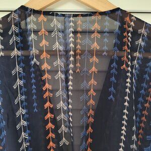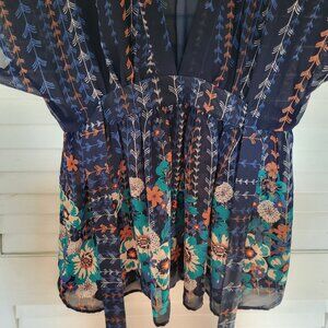 Excellent pre-owned condition size medium Xhilaration shear blouse in a semi-sheer navy blue, teal & rust/burnt orange colored fabric. This blouse has flowy sleeves and a tie "belted" empire waist as well as elastic across the back, peplum. Smoke-free home.