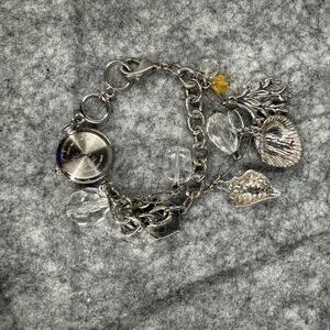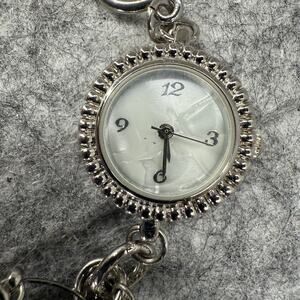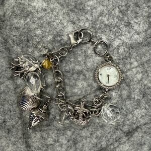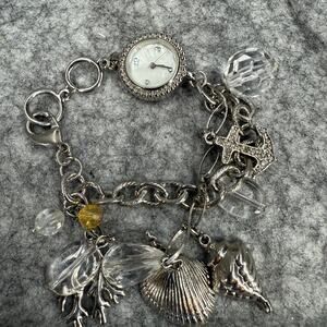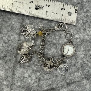 Pre-owned women’s Xhilaration silver charm bracelet watch FMDM 136. Ocean/beach them charms (anchor, sea shells, sea weed). Works and has new battery. Please see pictures. Item pictured is the one you will receive.