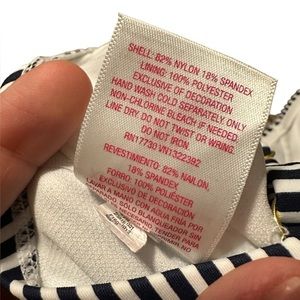 Top: Navy Blue and White Striped with shoe string tie in the front. D / DD size. Clasp in back with adjustable shoulder straps. Builtin push-up type similar to bra.