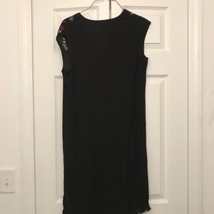 New without tags, women's Xhilaration brand dress, size M. Black with pretty red and white embroidered details. Also has black fringe at hem. I'm 5'4" and this dress falls about 2 inches or so above my knees. Dress is 100% rayon.