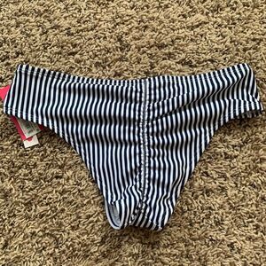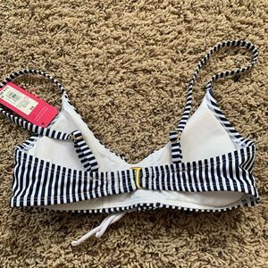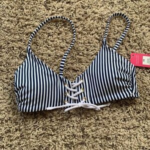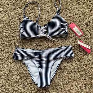 Brand new with tags, never worn. Originally 29.99. Cheeky style bikini bottom with cute tie front style top. Size XS, would fit an A cup top. And up to a size 2 bottom. Blue and white stripes.