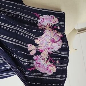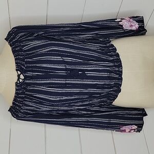 Xhilaration medium navy blue off shoulder top with embroidered flowers at wrists
