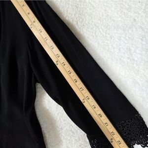 Classic Black Lace Sleeve & Hem Cardigan LChic and versatile black open-front cardigan by Xhilaration, size Large. Features beautiful lace trim along the hem and 3/4 sleeves for a feminine touch. Lightweight knit makes it perfect for layering over tanks, camis, or dresses.