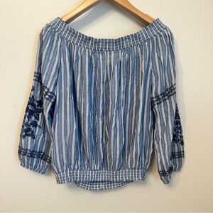 Size XS (oversized fit). Xhiliration Stylish blouse with blue and white stripes. Features a tassel tie front and elastic cuffs.